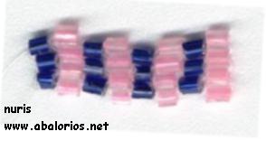 2. Añade 7 abalorios más. La base del ejemplo consta de 8 abalorios. En este ejemplo se han usado 2 colores, el rosa y el azul y para que quede cada fila de un color se añaden alternados ya que no tiene un final recto como se ve en la muestra.