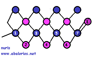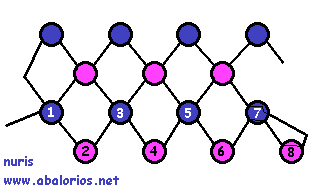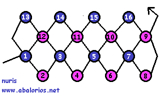 3. Una vez llegado al 8 añade el 9 del mismo color que ira en la fila siguiente, pasa el hilo por el primer azul que te encuentras que es el 7, añade uno nuevo rosa (10) vuelve por el siguiente azul (5) y así todo el rato hasta pasar por el primer azul que metiste en el inicio donde se volveria a meter un abalorio azul (13) para comenzar la fila siguiente. Aunque las explicaciones te resulten un poco enrevesadas no tienes mas que mirar el dibujo que muestro en la parte superior.