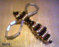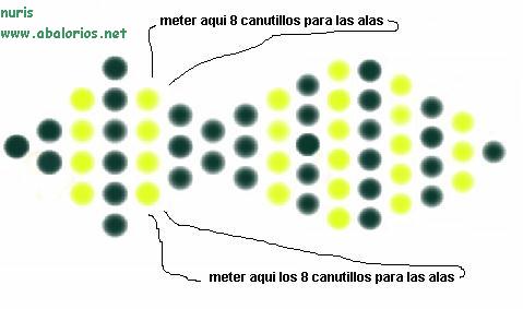 Para las alas, una vez enfiladas las 4 amarillas del cuerpo, se introducen 12 perlas alargadas amarillas y se vuelve a pasar el hilo por las 4 amarillas