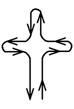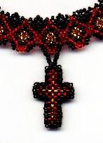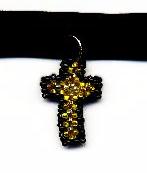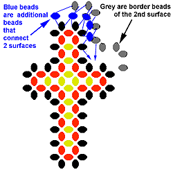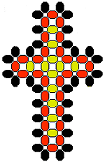 Para esta cruz se utiliza la técnica de la puntada redonda (right angle wave), concretamente la segunda forma que se muestra en el taller. Se trata de ir cruzando los hilos y añadiendo los abalorios a la vez, fijate en el esquema, donde se comienza por abajo. Es como si hicieramos un enfilado cruzado y seguimos la ruta trazada del dibujo.