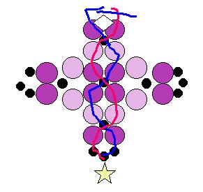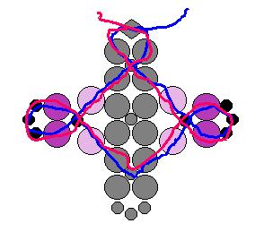 segun el esquema, 7. pasar el hilo en la rocalla despues en la bola a la izquierda segun el esquema ensartar 1 bola, 8. pasar el hilo en 1 rocalla, ensartar 1 bola, 3 rocallas, 1 bola, 9. pasar el hilo en la rocalla ensartar 1 nueva bola pasar el hilo en la bola que se encuentra abajo a la derecha de la que se viene de ensartar, 10. pasar el hilo en la rocalla y en la bola que se encuentra a su derecha, 11. ensartar 1 bola, 1 rocalla, 1 bola, 3 rocallas, 1 bola pasar en la rocalla, 12. ensartar 1 bola y pasar el hilo en la bola de arriba que se encuentra a la izquierda de la que se viene de ensartar, 13. pasar de nuevo en la rocalla y en la bola que se encuentra arriba en la izquierda y en la tupie, 14 . Repetir 6 a 13 con el hilo rojo invertiendo el sentido. |