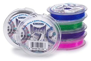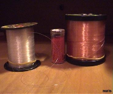 Este es el hilo de nylon tambien llamado de pescar pues es el que utilizan los pescadores. Le hay en diferentes colores, grosores y tamaños de carrete, cuanto mas grande sea el carrete mas barato os saldrá el metro de nylon. Os recomiendo comprar uno transparente. Yo personalmente no le uso pq utilizo el de polyester pero podeis hacer multitud de cosas con el, collares, pendientes, anillos... Muchas de las que entrais en esta web lo usais para realizar animales en 3D ya que el mismo coge la forma y asi lo recomendais en el foro pero la cuestion es probar y ver cual gusta mas por ejemplo con el alambre luego podeis poner posiciones a los animales, asi que no hay regla fija sobre los materiales, cada cual lo hace con el que mejor le venga segun sus gustos personales. Lo podeis comprar en tiendas de pesca en vez de en mercerias ya que os saldrá mas barato.